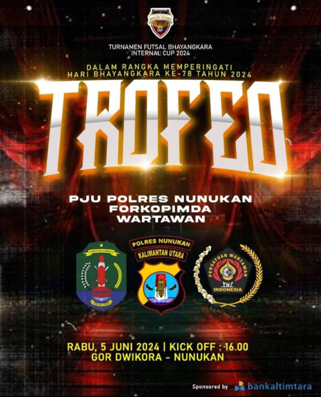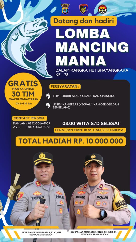 Nunukan. Ada beberapa kegiatan Kapolres Nunukan. Mengadakan kegiatan berupa. PJU Polres Nunukan Forkopimda. WArtawan. Rabu 5 Juli/2024. . Kick of jam 16.00 wite.. Gor Dwikora Nunukan. Kab Nunukan prov kalimantan utara..guna menyambut Hari ulang tahun (HUT) bhayangkari yang ke- 78 . Nunukan. Yang jatuh tanggal 1 Juli 2024. dan kegiatan jatuh tanggal rabu 5 Juli 2024. Yang lalu. Kegiatan di lapangan Gor Dwikora . Berupa Turnamen Futsal’- Bhayangkari internal cup 2024. Kegiatan ini ada juga lomba mancing mania . Dalam rangka kegiatan masyarakat Nunukan diharapkan mendapat persyaratan 1 Tim terdiri atas 5 orang dan 5 pancing jenis ikan bebas. Kecuali ikan ote ose dan sembilang di perairan Mantikas dan sekitarnya . Total berhadiah 10 . 000’000- gratis hanya untuk 30 Tim.. Mendukung kesuksesan perayaan HUT bhayangkari ke-78-.