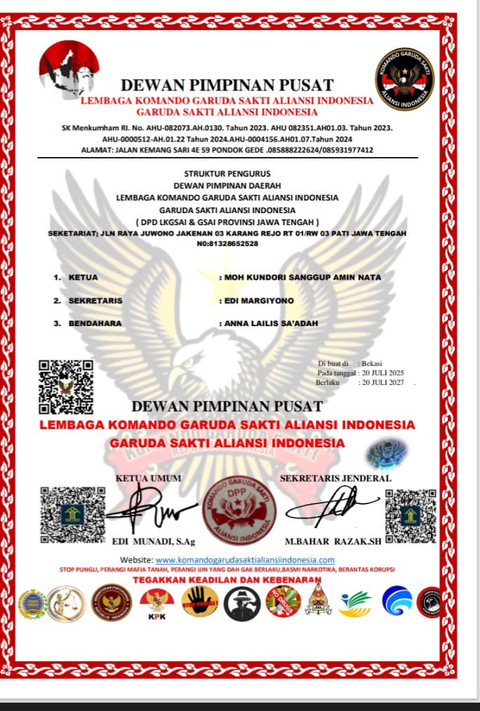 Semarang, 17 Juli 2025 — Lembaga Komando Garuda Sakti Aliansi Indonesia (LKGSAI) kembali memperkuat eksistensinya di tingkat daerah dengan disahkannya kepengurusan Dewan Pimpinan Daerah (DPD) LKGSAI Provinsi Jawa Tengah. Struktur organisasi yang kini telah terbentuk resmi ini menjadi bukti keseriusan LKGSAI dalam membangun jaringan kerja nyata di seluruh wilayah Indonesia.
