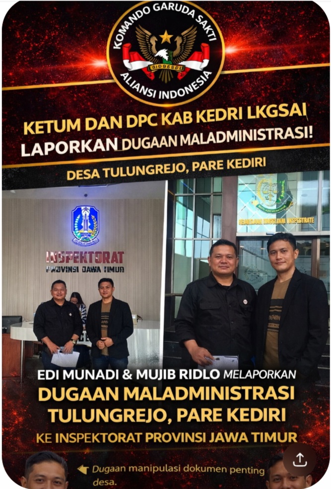 Kediri – Ketua Umum Lembaga Komando Garuda Sakti Aliansi Indonesia (LKGSAI), Edi Munadi, bersama jajaran DPC Kabupaten Kediri, resmi melaporkan dugaan maladministrasi yang terjadi di Desa Tulungrejo, Kecamatan Pare, Kabupaten Kediri.