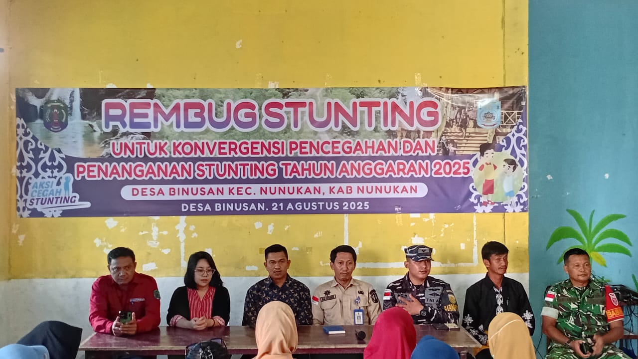 Nunukan, 21 Agustus 2025 – Pemerintah Desa Binusan Kecamatan Nunukan, Kabupaten Nunukan, Kalimantan Utara, menggelar Rembug Stunting di kantor Posyandu Desa Binusan. Kegiatan ini dihadiri langsung oleh Kepala Desa Binusan, Rudi Hartono, beserta perangkat desa, ketua RT, kader posyandu, pendamping desa, Babinsa Koramil Kodim 0911 Nunukan, Danpomal Lanal Nunukan, serta tenaga medis dari Puskesmas Binusan.